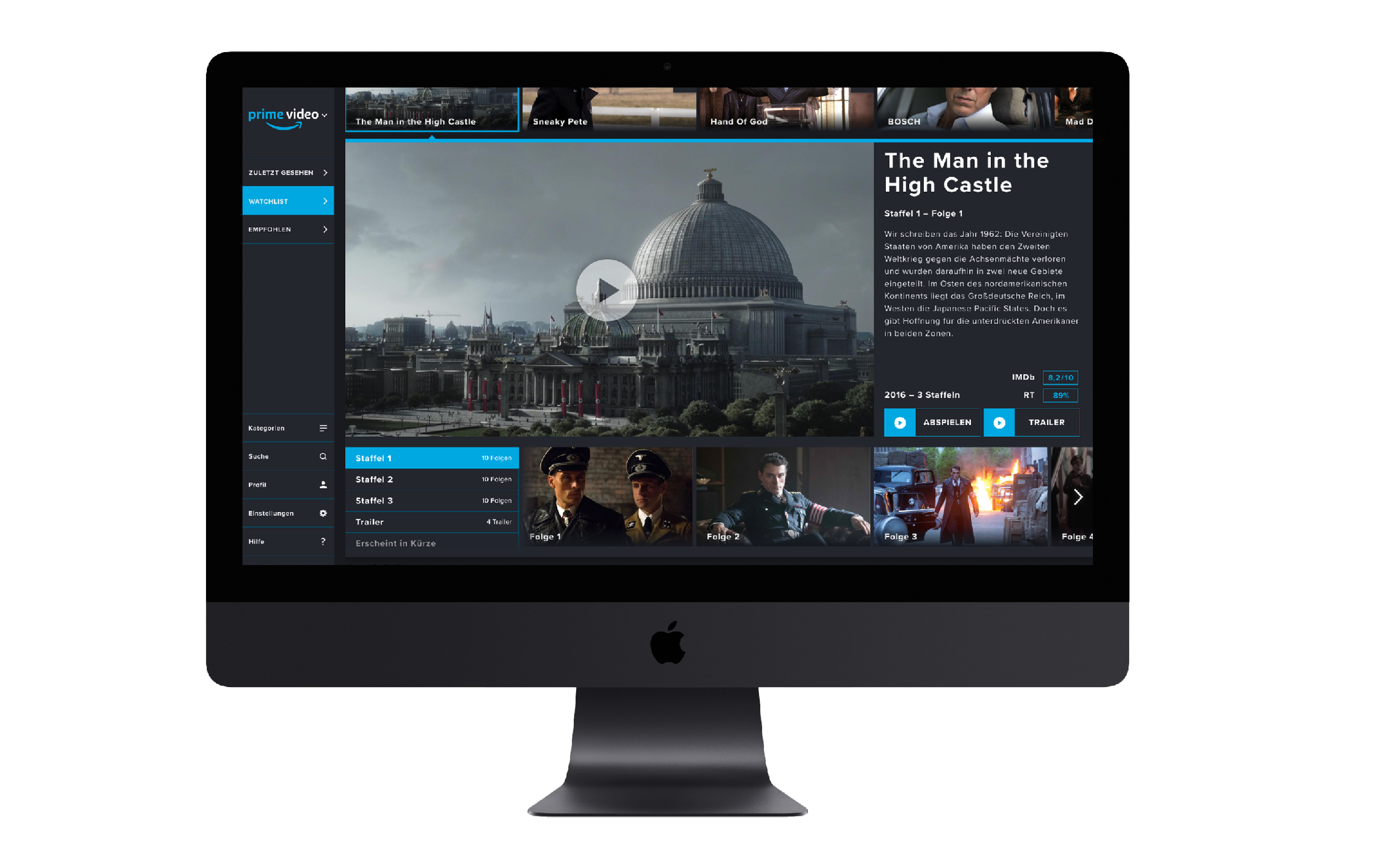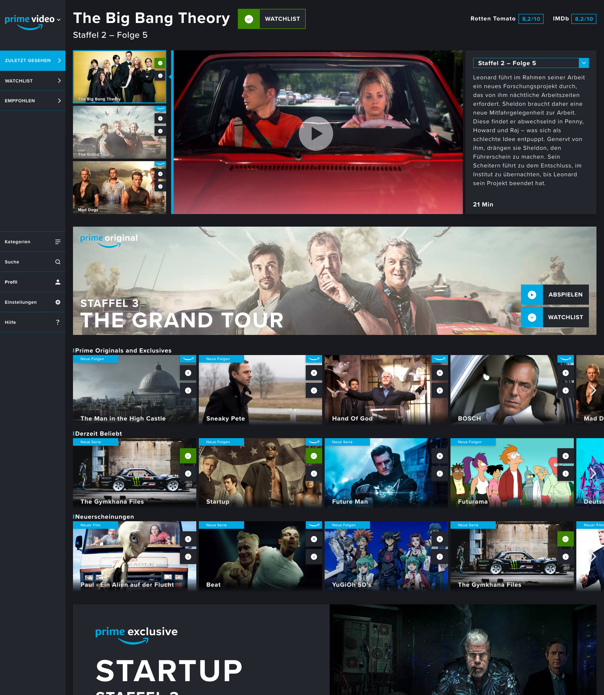 Gegenüber dem Nutzer hat Prime Video momentan ein großes Problem: Es gibt im Gegensatz zur Konkurrenz keinen einfachen Weg zwischen Kategorien wie "Zuletzt gesehen" und "Watchlist" zu wechseln. Bei meinem Redesign war das ein wichtiger Bestandteil, der die Bedienung überschaubarer und einfacher gestalten soll.