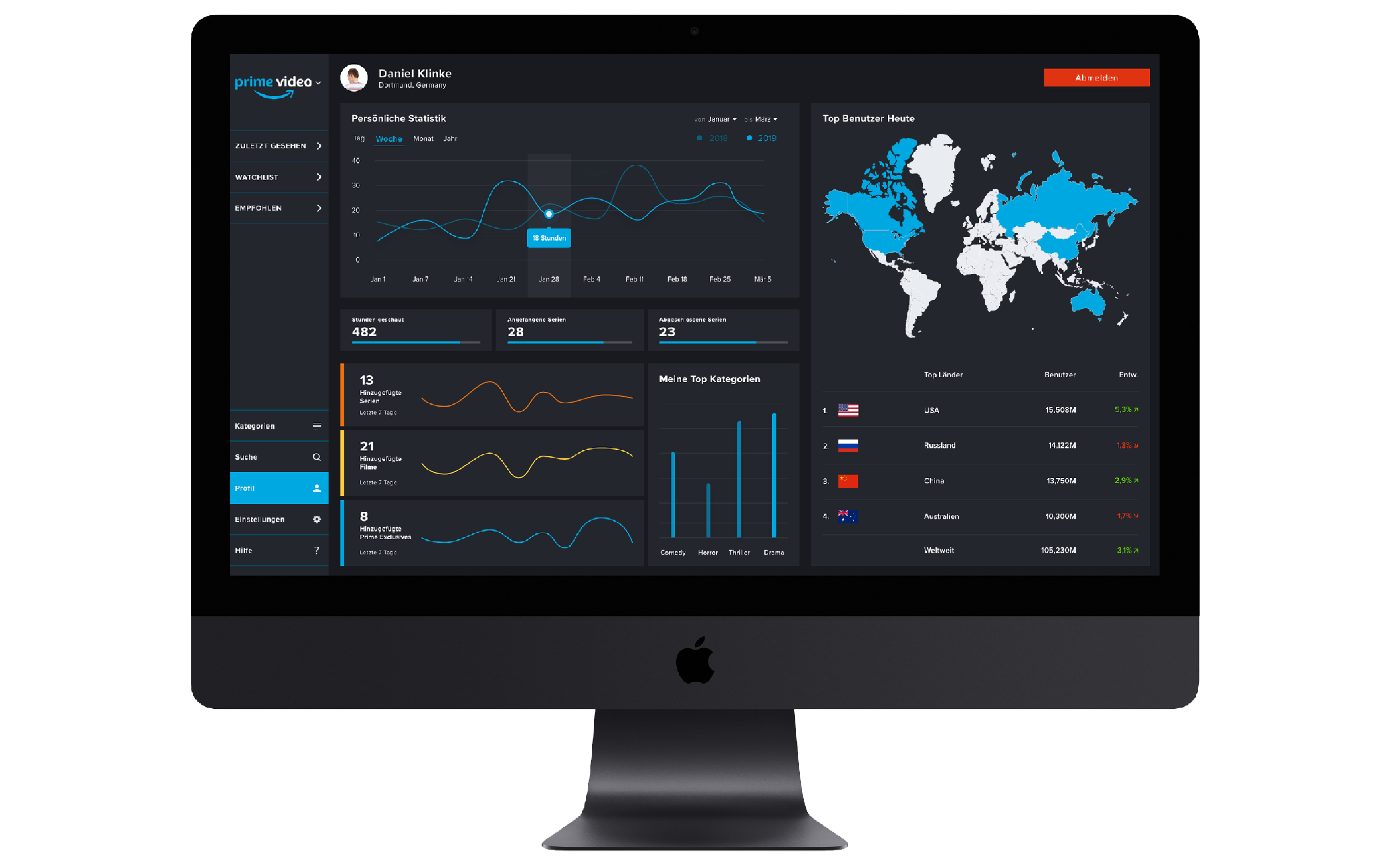Viele Nutzer fragen sich, wie viel Zeit sie in Ihrem Leben dem Bingen widmen. Da Amazon über eine umfangreiche Datenerfassung verfügt, habe ich mich dazu entschieden die Kategorie "Profil" mit einzubinden. In diesem Bereich kann der Nutzer alle wichtigen Informationen bezüglich seines Accounts sehen und seine Daten mit vergangenen Werten vergleichen.